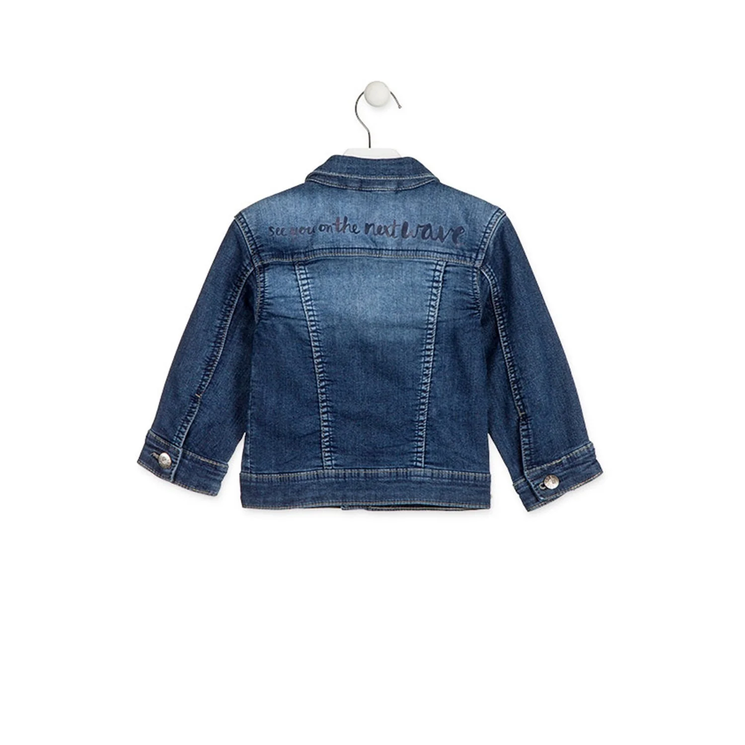 Giacca di jeans per bambino. Giacca con scritte stampate sul davanti e retro. Taschino sul petto con pattina. Bottoni metallici personalizzati marca Losan.