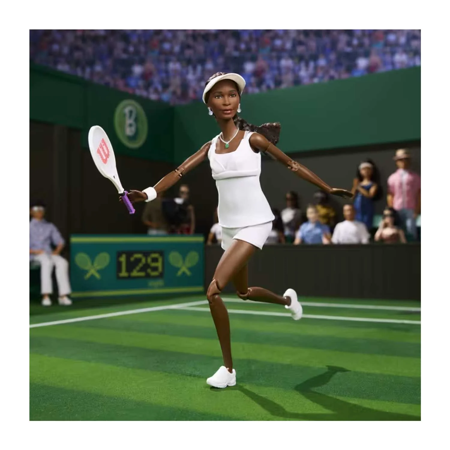 • Questa bambola Barbie Inspiring Women rende omaggio a Venus Williams, campionessa mondiale di tennis che è stata portavoce per la parità dei premi in denaro tra uomini e donne.