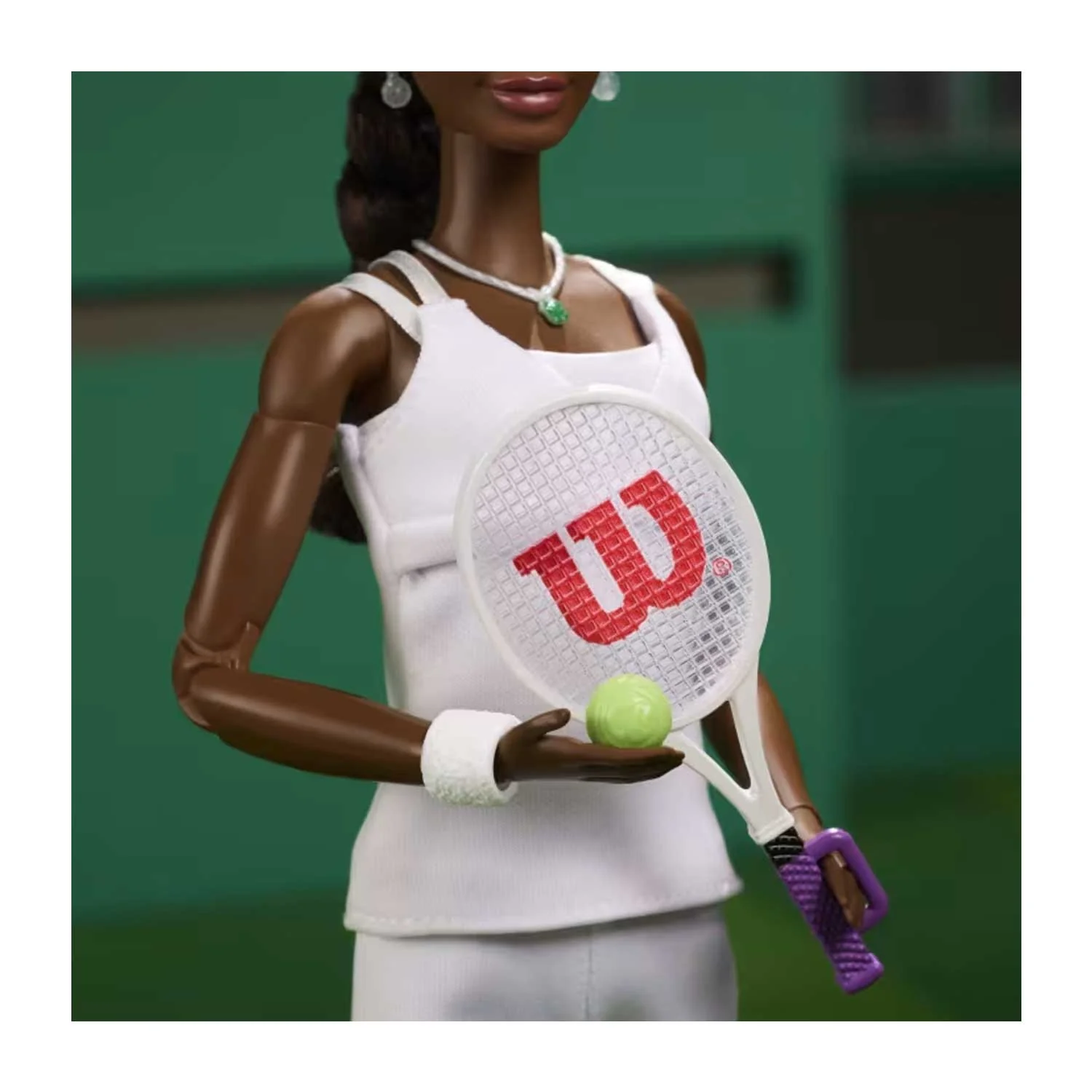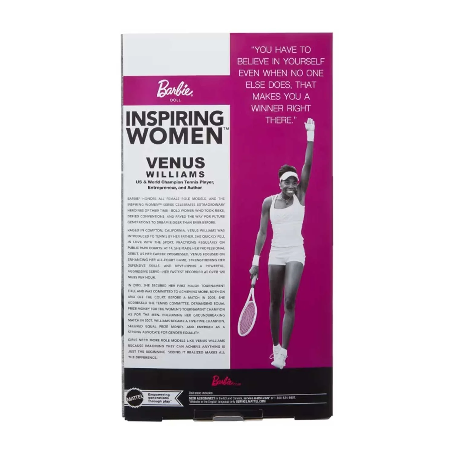 La linea Barbie Inspiring Women rende omaggio alle eroine più straordinarie del loro tempo: donne coraggiose che hanno corso dei rischi, cambiato le regole e spianato la strada affinché le future generazioni di ragazze potessero sognare più in grande che mai. Nonostante si sia trovata di fronte alla discriminazione di genere durante la sua carriera nel tennis, Venus Williams si è impegnata per raggiungere un maggior successo sia sul campo che fuori. Ha richiesto lo stesso premio di denaro per chi vince il torneo di tennis femminile e maschile Realizzata secondo la sua immagine e con la sua uniforme da tennis per i tornei del 2007, tra cui visiera, racchetta e palla da tennis, questa bambola Barbie da collezione rende omaggio alla portavoce e campionessa di tennis mondiale. Include piedistallo e certificato di autenticità