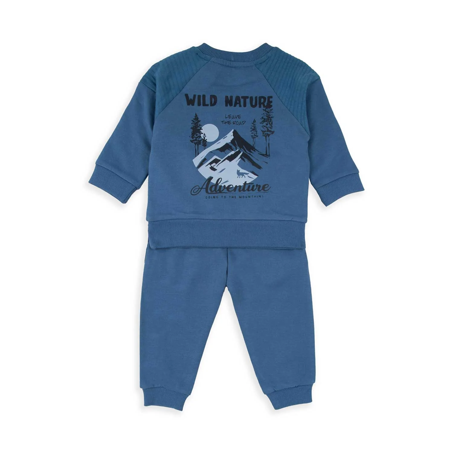 La felpa girocollo, in un accattivante blu scuro, presenta una grafica sul retro dedicata alla “Wild Nature” con montagne, alberi, la luna e un lupo, accompagnata dalla frase “Adventure – Going to the mountains”.