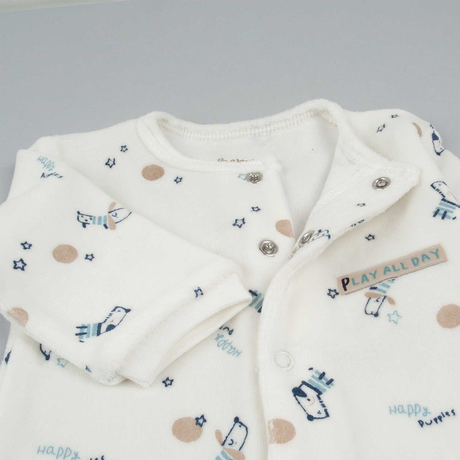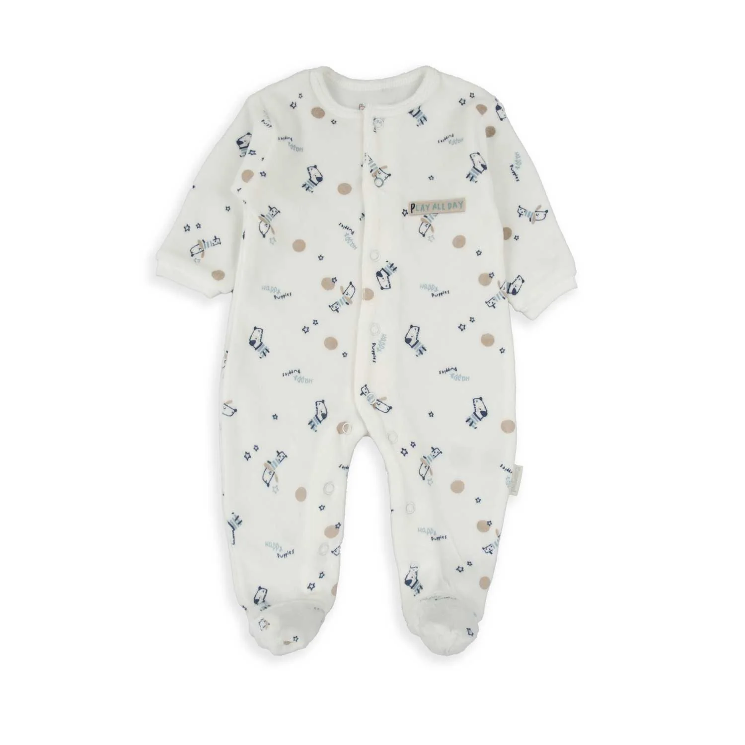 Tutina in ciniglia color panna, decorata con una simpatica fantasia all-over di cuccioli e pois. Il dettaglio frontale che aggiunge un tocco di dolcezza perfetto per ogni occasione, dal gioco alla nanna.